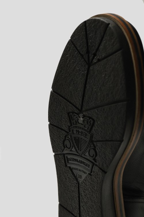 Детали: Женские черные ботинки из натуральной кожи от Norma J. Baker (Норма Джин Бейкер). Дизайн в виде комбинации материалов со вставками из натуральной замши, широкая подошва с контрастными полосками и логотипом бренда, закругленный носок, модель без застежки, сбоку логотип выполнен из кристаллов, меховая опушка, утеплены натуральным мехом. Измерения: высота голенища: 14 см