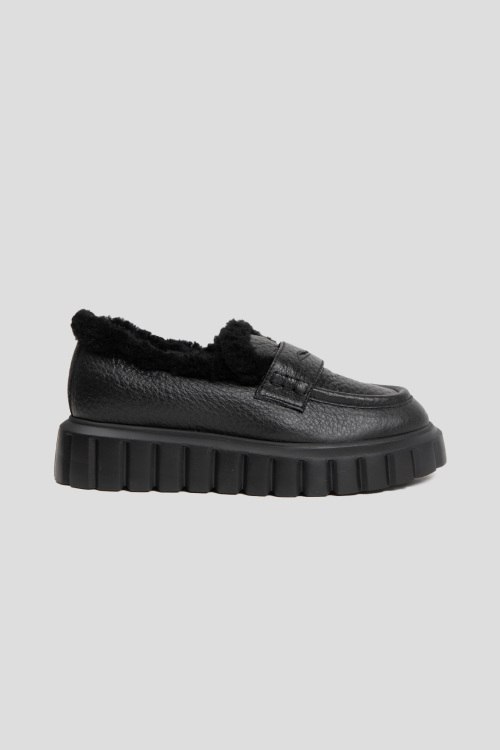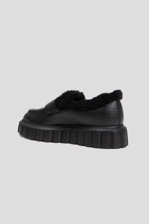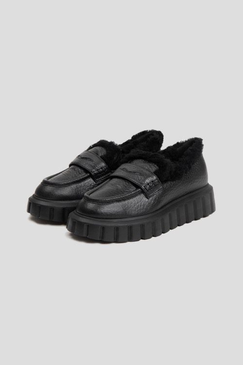 Детали: Женские черные кожаные лоферы на меху от Voile Blanche (Вуаль Бланш). Модель из зернистой кожи, меховая отделка, закругленный носок, внутри на меху