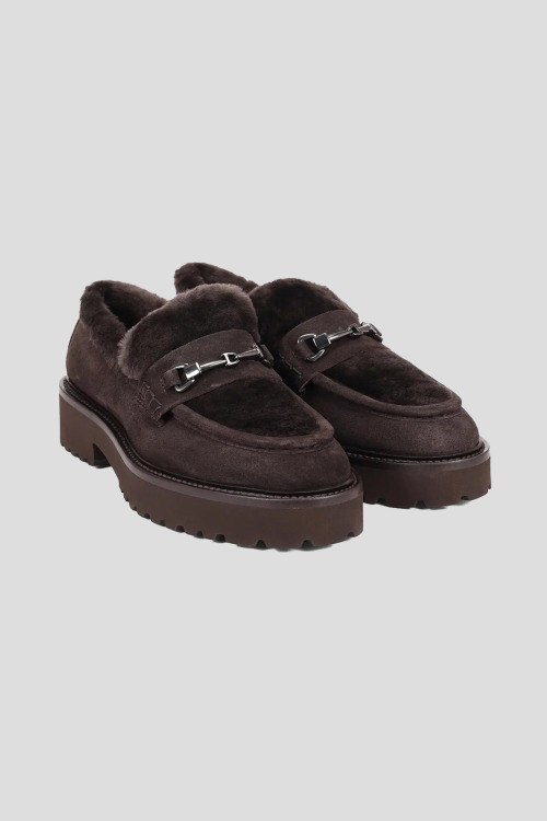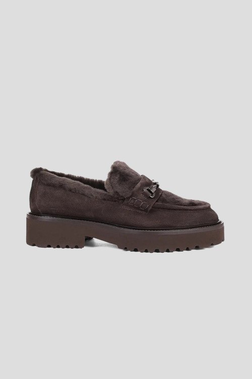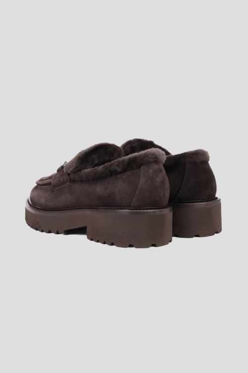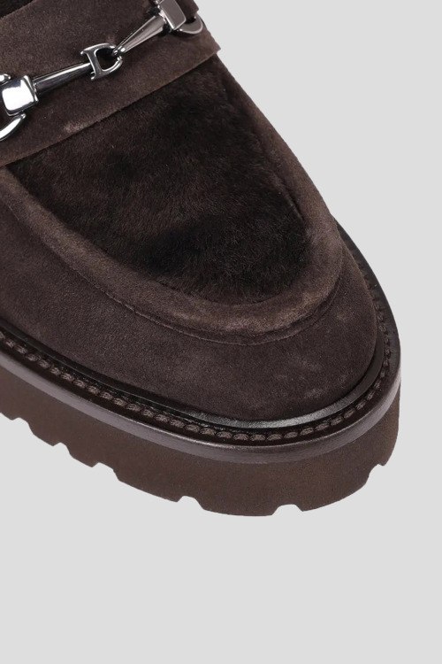 Детали: Женские темно-коричневые замшевые лоферы на меху от Doucal's (Дукалс). Серебристая фурнитура, меховая отделка, закругленный носок, внутри на меху