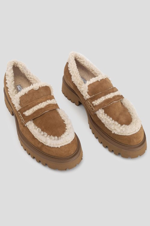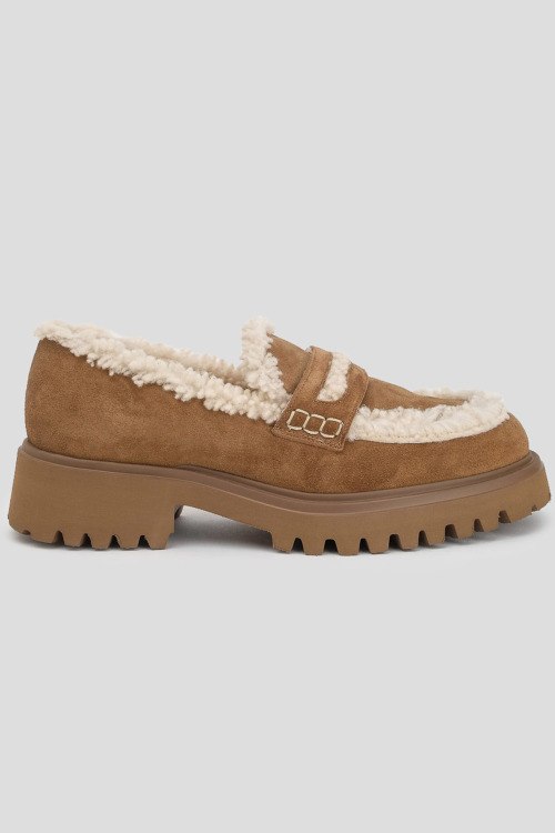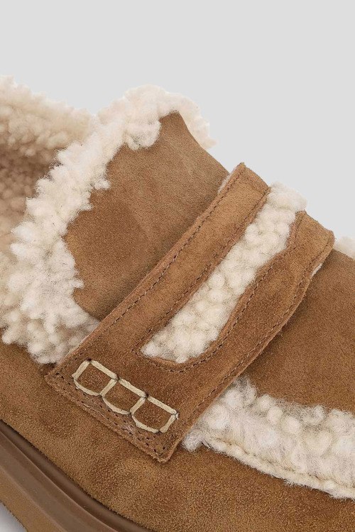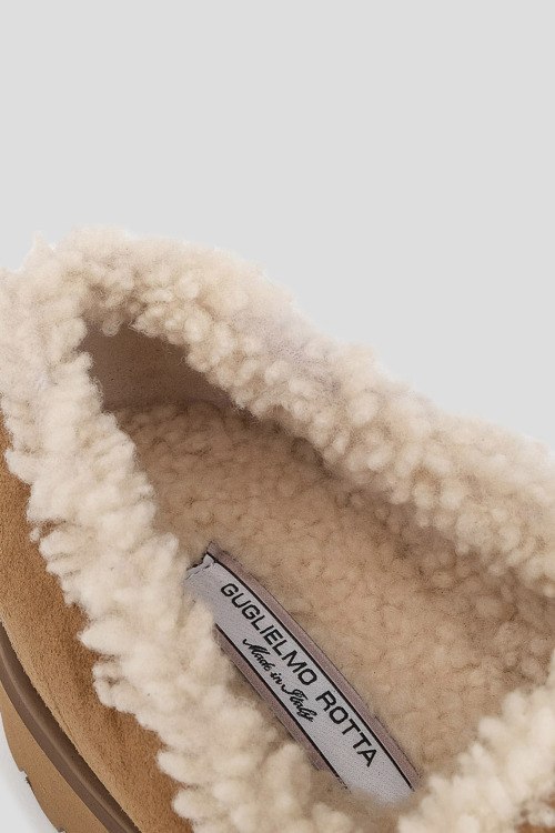Детали: Женские замшевые лоферы на меху цвета кэмел от Guglielmo Rotta (Гульельмо Ротта). Меховая отделка, закругленный носок, массивная подошва, внутри на меху