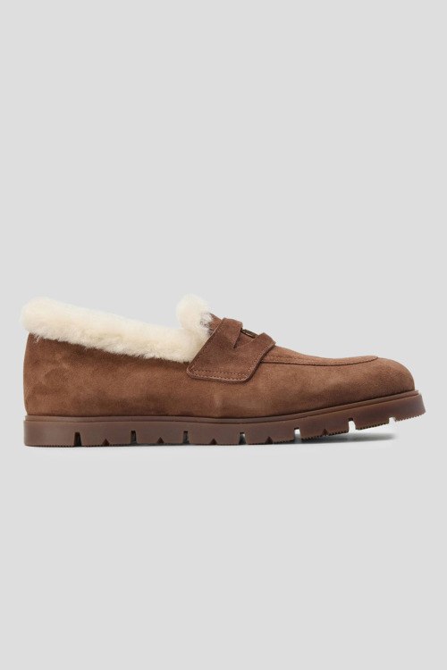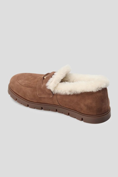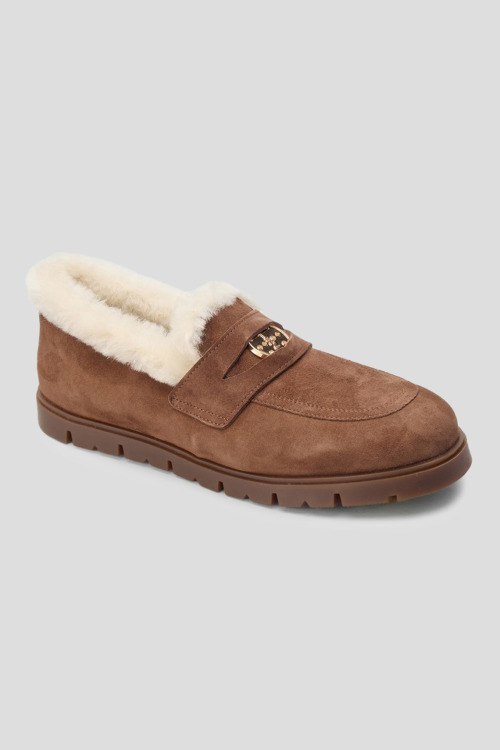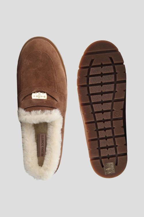 Детали: Женские коричневые замшевые лоферы на меху от Helena Soretti (Хелена Соретти). Нашивка с логотипом, меховая отделка, закругленный носок, внутри на меху