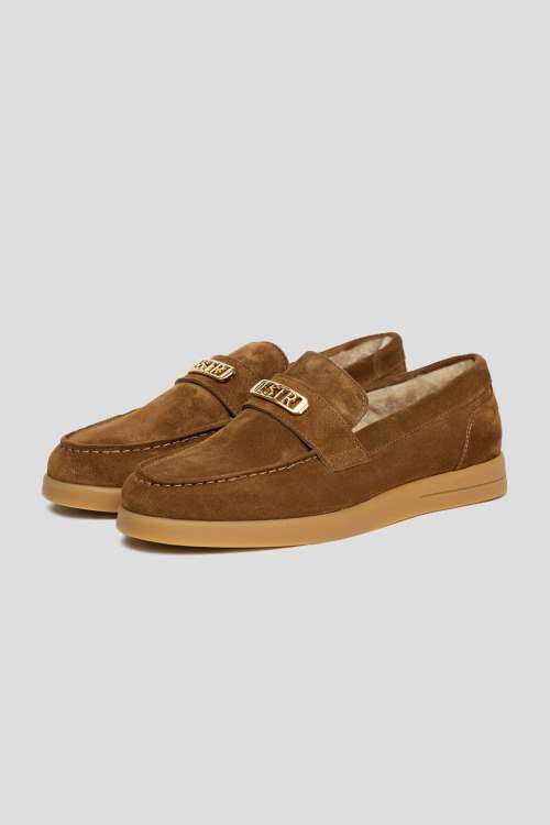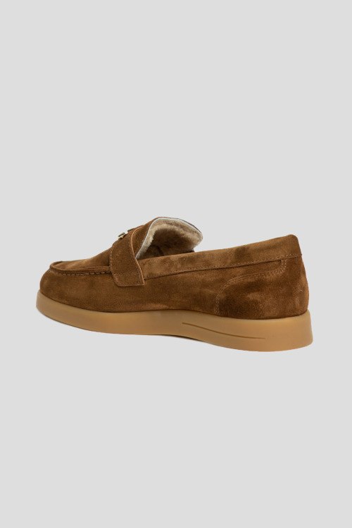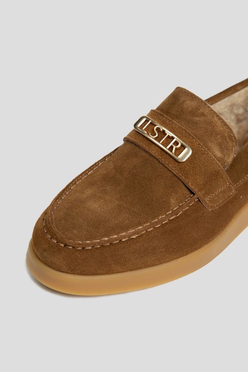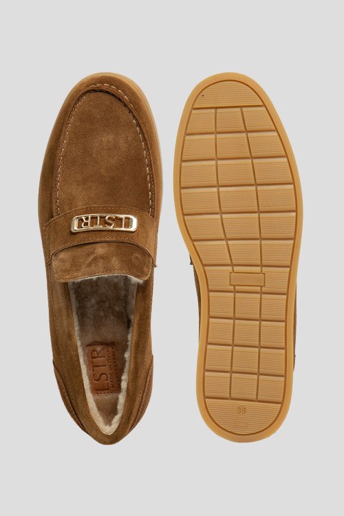 Детали: Женские коричневые лоферы из натуральной замши от L'Estrosa (Лестроса). Миндалевидный носок, модель утепленная натуральным мехом, металлическая пряжка золотистого цвета