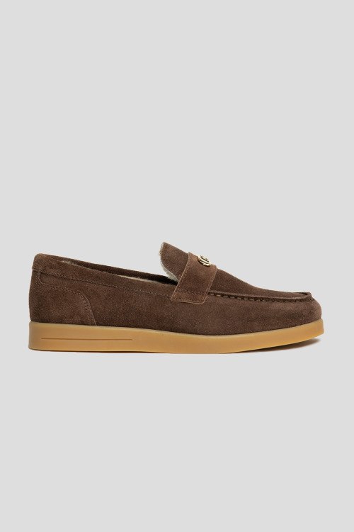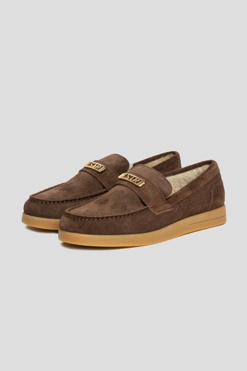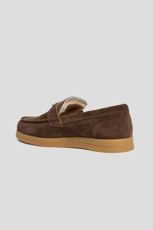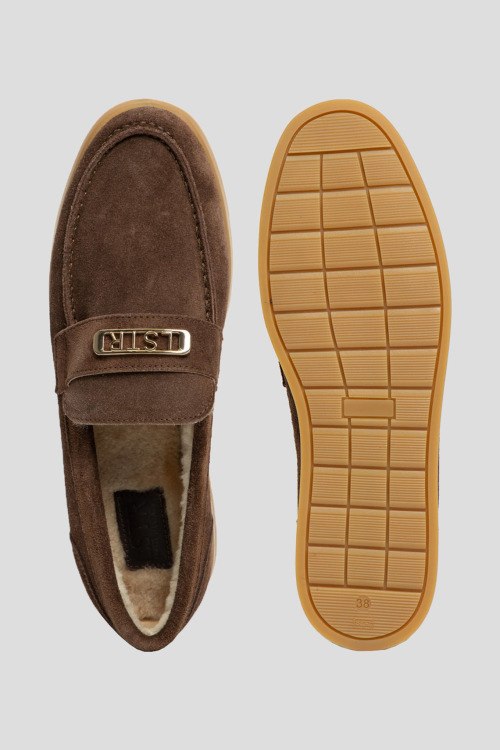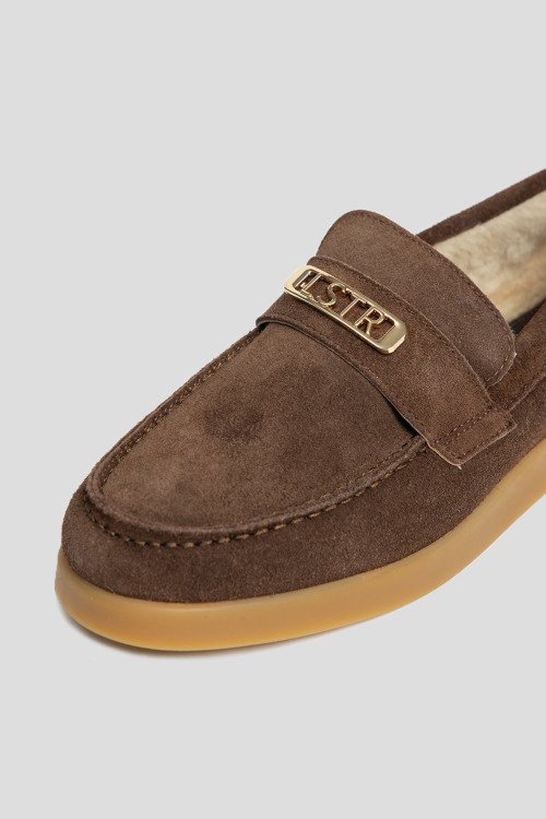 Детали: Женские темно-коричневые лоферы из натуральной замши от L'Estrosa (Лестроса). Миндалевидный носок, модель утепленная натуральным мехом, металлическая пряжка золотистого цвета