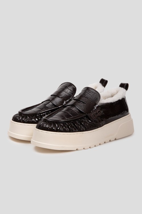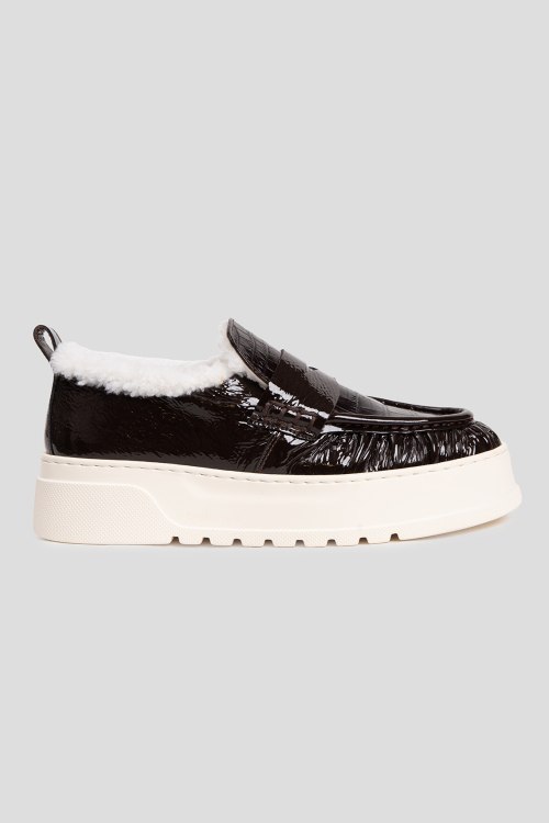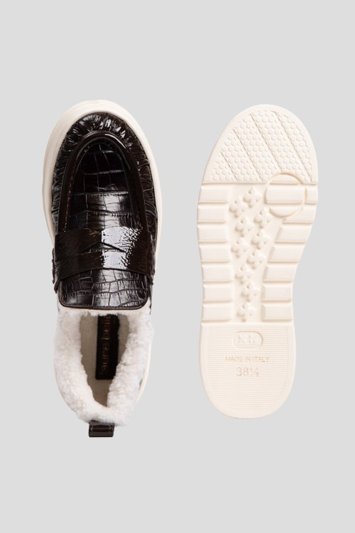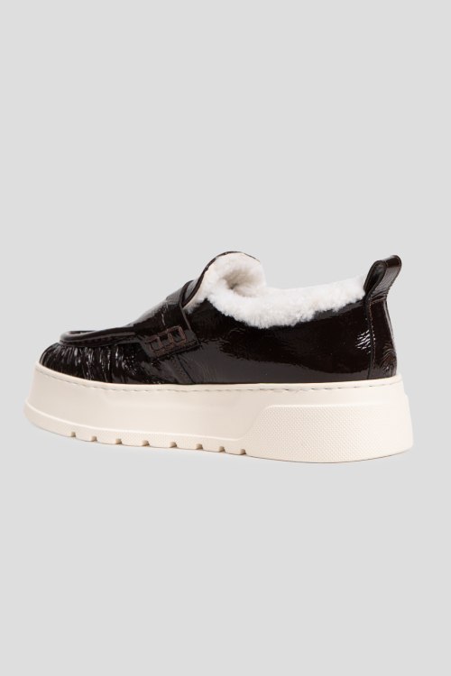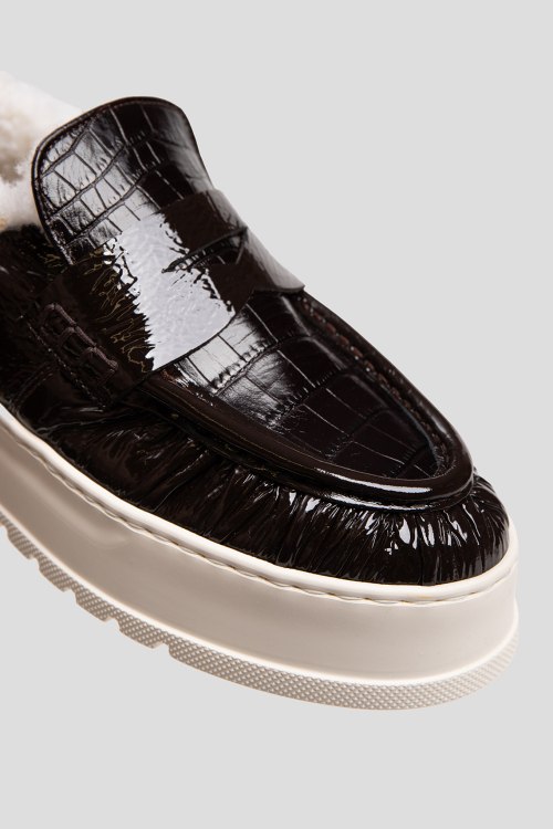 Детали: Женские темно-коричневые лаковые лоферы на меху от Laura Bellariva (Лаура Белларива). Глянцевый эффект, петля для подтягивания сзади, закругленный носок, высокая подошва, внутри на меху. Подошва: 5 см