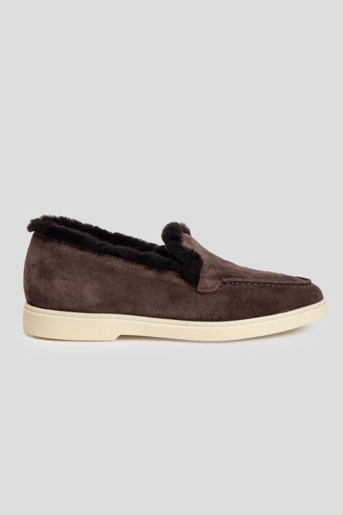Детали: Женские коричневые замшевые лоферы на меху от Santoni (Сантони). Меховая отделка, миндалевидный носок, внутри на меху, светлая подошва
