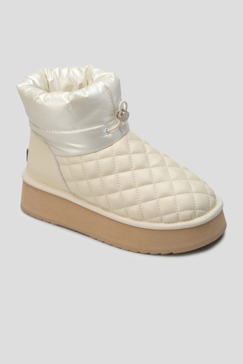 Детали: Женские ботинки на меху из кожи и текстиля молочного оттенка от Ilasio Renzoni (Иласио Рензони). Комбинация материалов, стеганый дизайн, нашивка с логотипом на пятке, закругленный носок, внутри на меху. Подошва: 5 см, высота голенища: 13 см