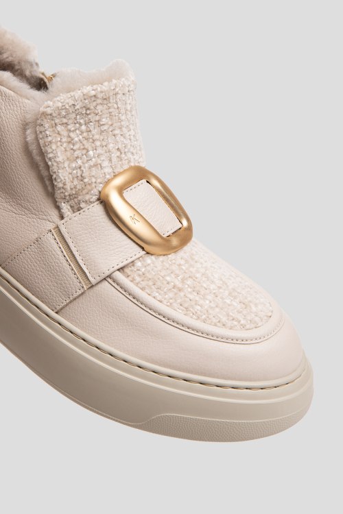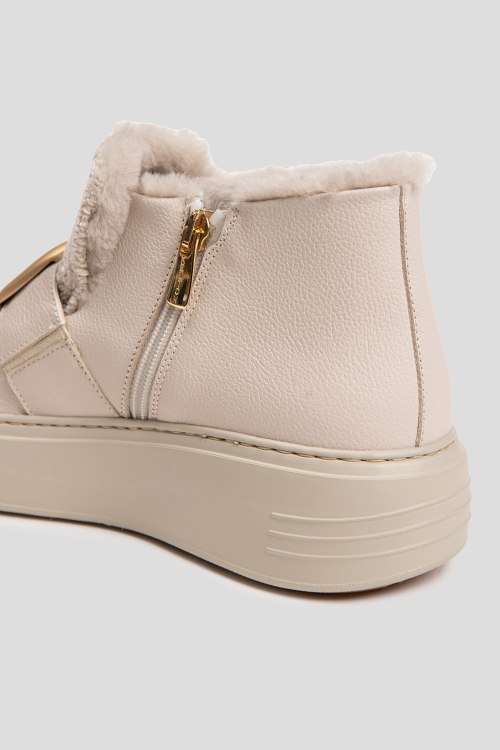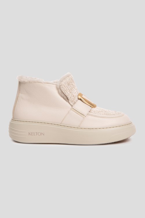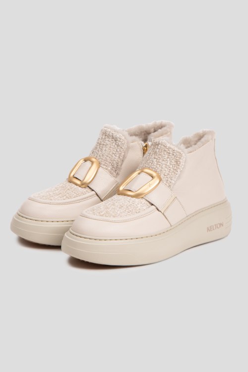 Детали: Женские кожаные ботинки на меху молочного оттенка от Kelton (Кельтон). Золотистая фурнитура, застежка-молния сбоку, закругленный носок, резиновая подошва, внутри на меху. Высота каблука: 5 см, подошва: 3 см, высота голенища: 8 см. Замеры указаны для: 38 размера