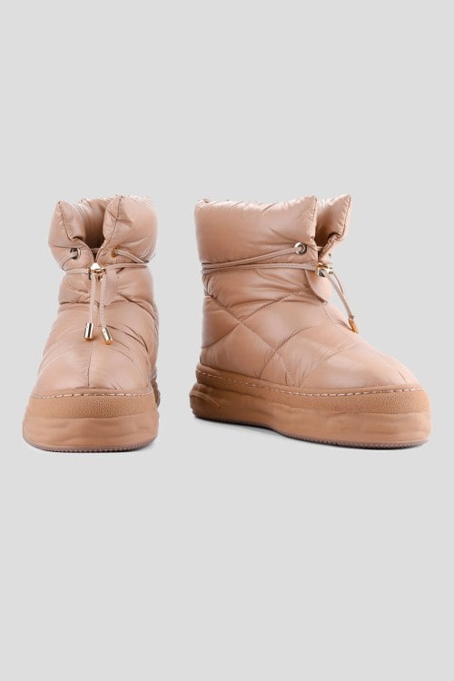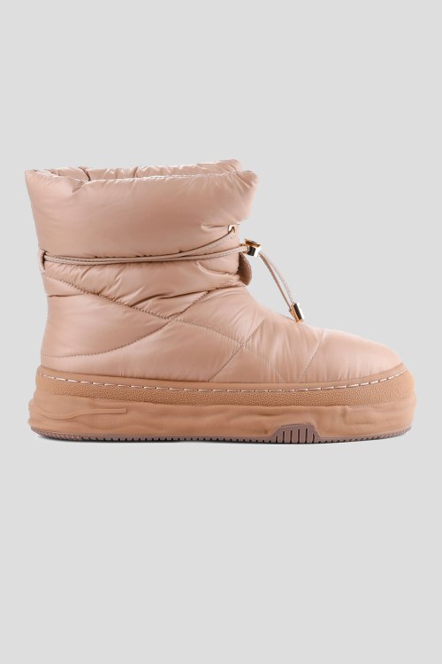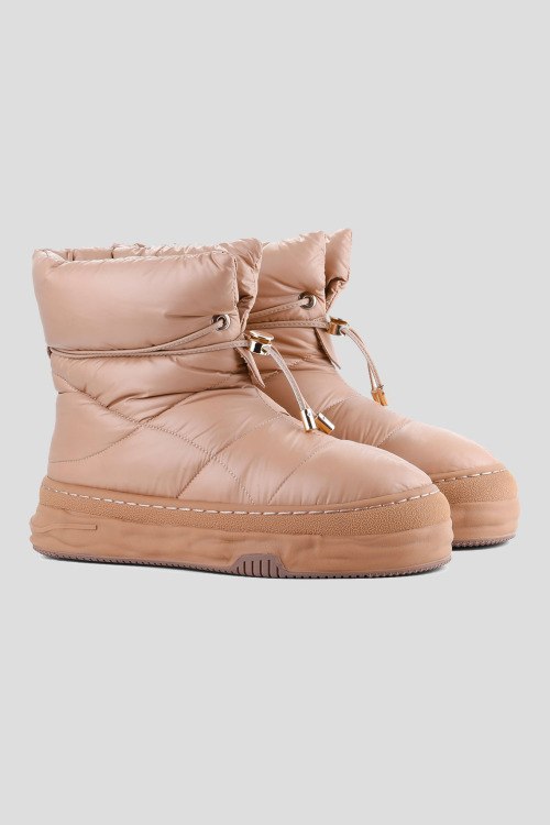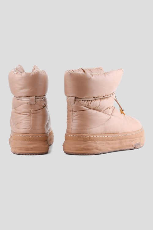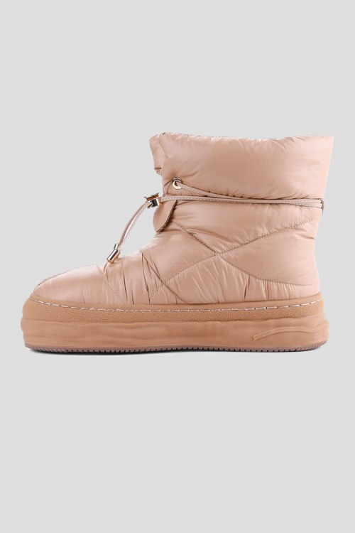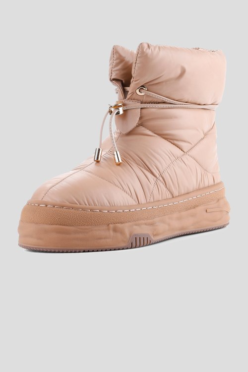Женские светло-бежевые ботинки из непромокаемого текстиля (тонкий и мягкий болоний) от Le Berdes (Ле Бердес). Закругленный носок, стеганый дизайн, спереди шнуровка, массивная структурная подошва, модель утеплена мехом