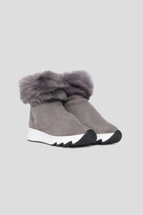 Женские серые замшевые ботинки от Renzi (Рензи). Закругленный носок, рельефная подошва, модель без застежки, меховая отделка, внутри утепленные натуральным мехом
