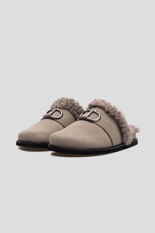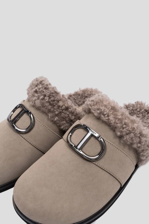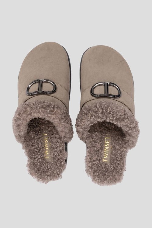 Детали: Женские серые мюли от TWINSET (Твинсет). Закругленный закрытый носок, открытая пятка, спереди металлический логотип логотип бренда, утепленная модель