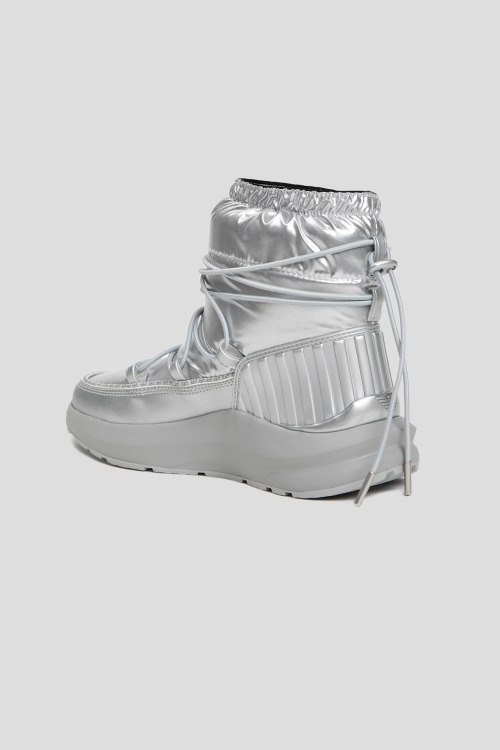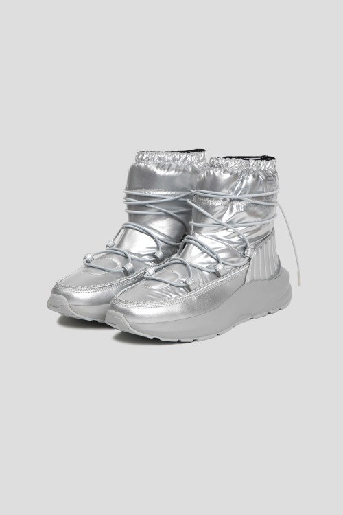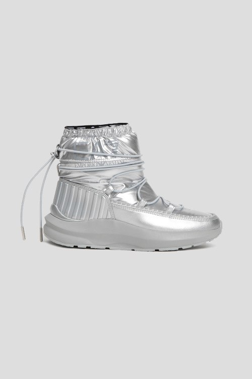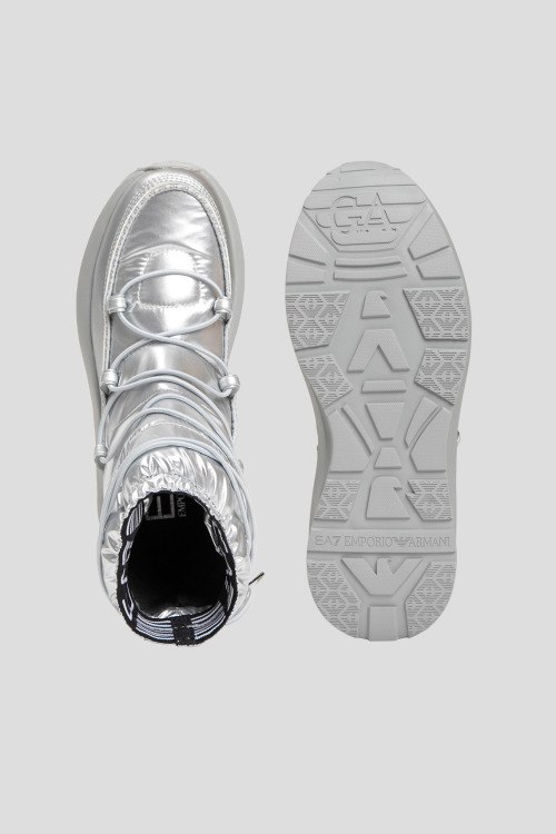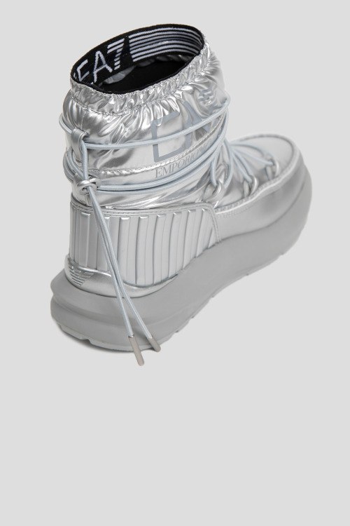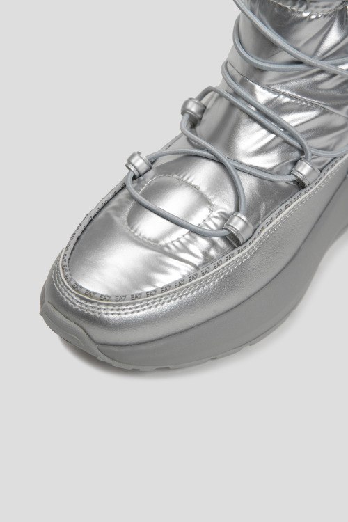Детали: Женские серебристые ботинки от EA7 Emporio Armani (ЕА7 Эмпорио Армани). Эффект металлик, шнуровка на затяжке, принт с логотипом, закругленный носок, утеплены синтетическим материалом