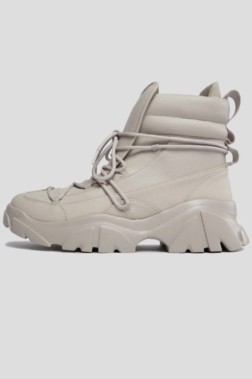 Детали: Женские светло-серые ботинки из экокожи от EA7 Emporio Armani (ЕА7 Эмпорио Армани). Гладкий материал, нашивка с логотипом на язычке, шнуровка вокруг ноги, закругленный носок, массивная подошва. Высота подошвы: 4,5 см