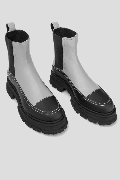 Детали: Женские серые ботинки-челси из натуральной кожи от Emporio Armani (Эмпорио Армани). Закругленный носок, дизайн в стиле колор-блок, эластичные резинки по бокам, тракторная подошва, петля для подтягивания