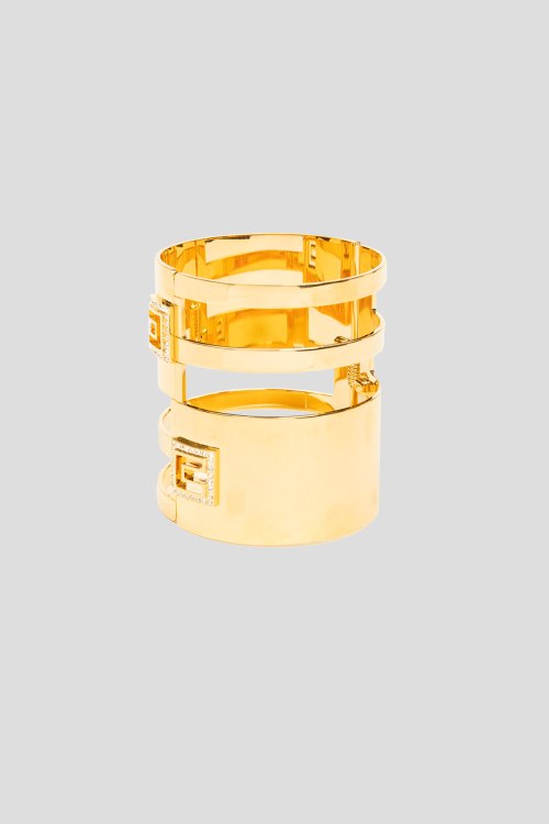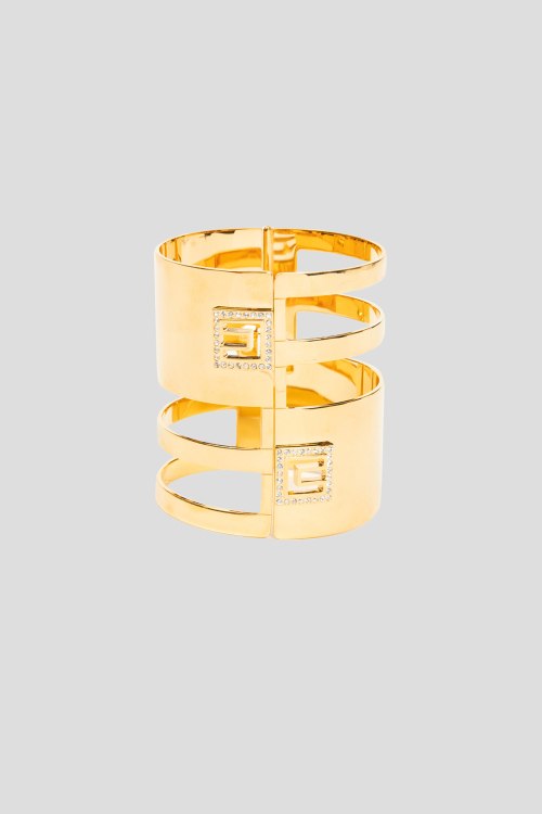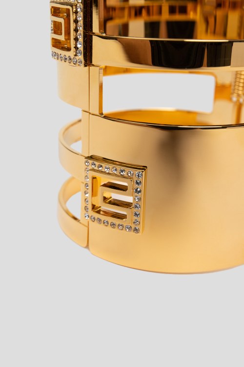 Детали: Женский золотистый браслет из латуни от Elisabetta Franchi (Елизабетта Франчи). Широкая модель, декорирован кристаллами, логотип бренда. Измерения: ширина 7 см