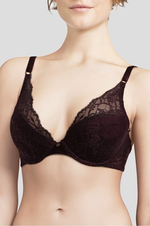 Детали: Женский темно-фиолетовый бюстгальтер из полиамида и эластана от Chantelle (Шантель). Уплотненная чашечка, тонкие регулируемые бретели, застежка на спине на крючки, кружевные вставки