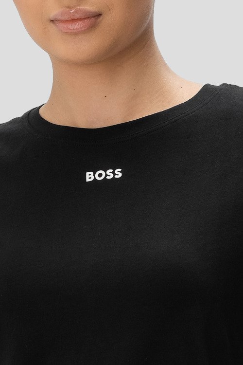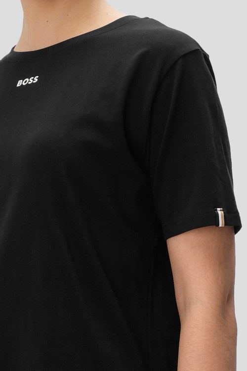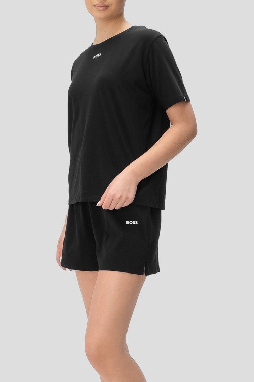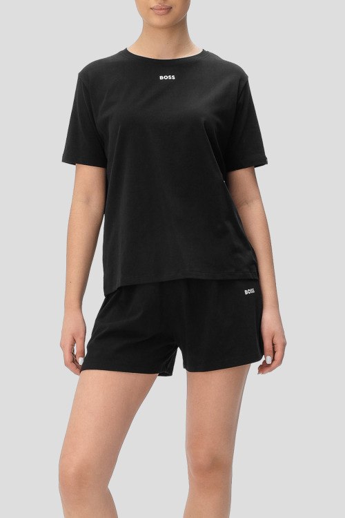 Детали: Женский черный комплект для дома из хлопкового микса от Hugo Boss (Хуго Босс). Футболка классической длины, круглый вырез горловины, короткие рукава, логотип бренда на груди, короткие шорты с эластичной резинкой на поясе