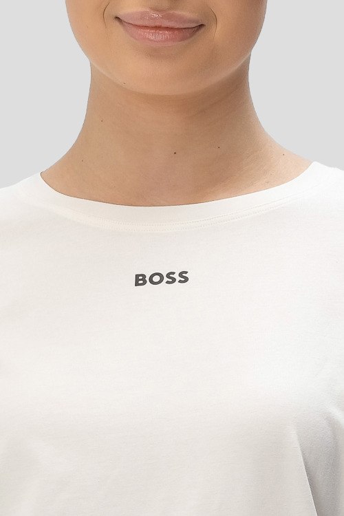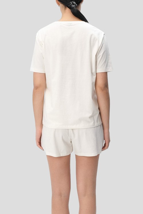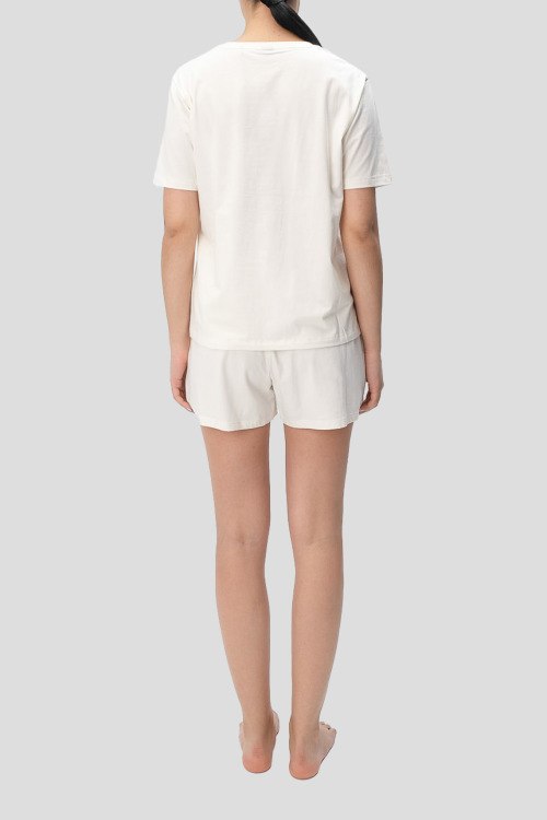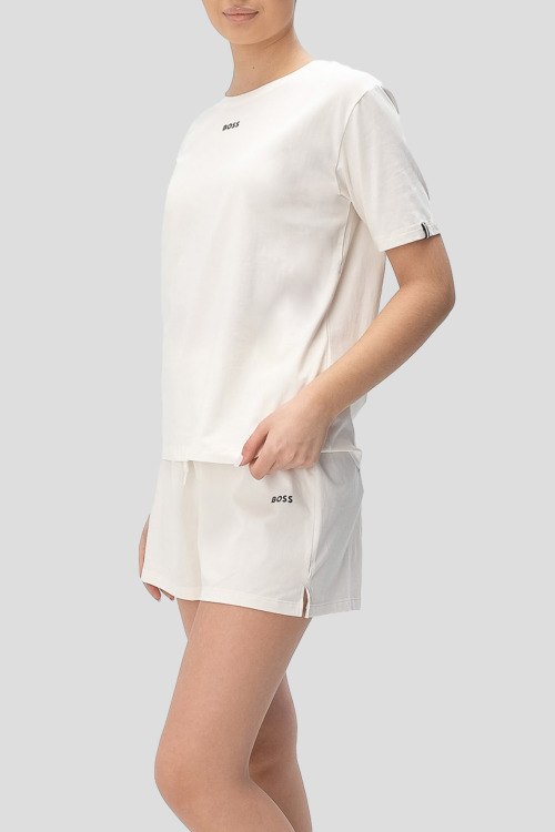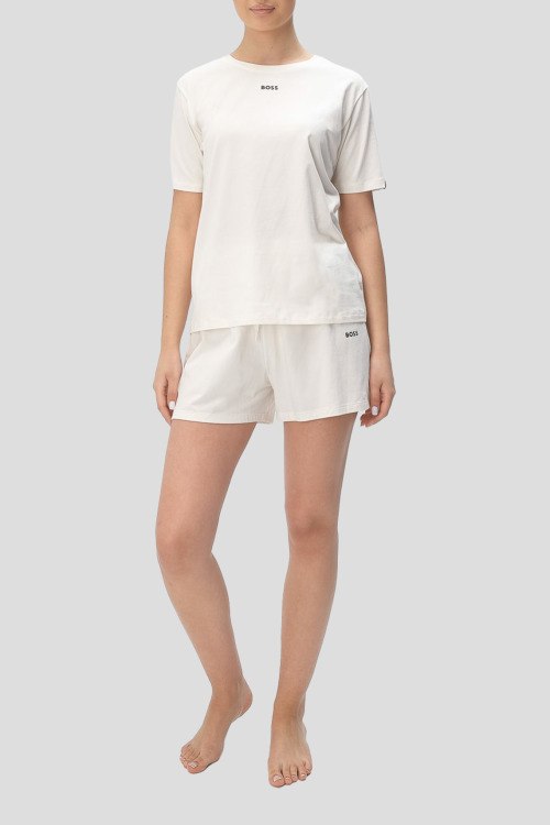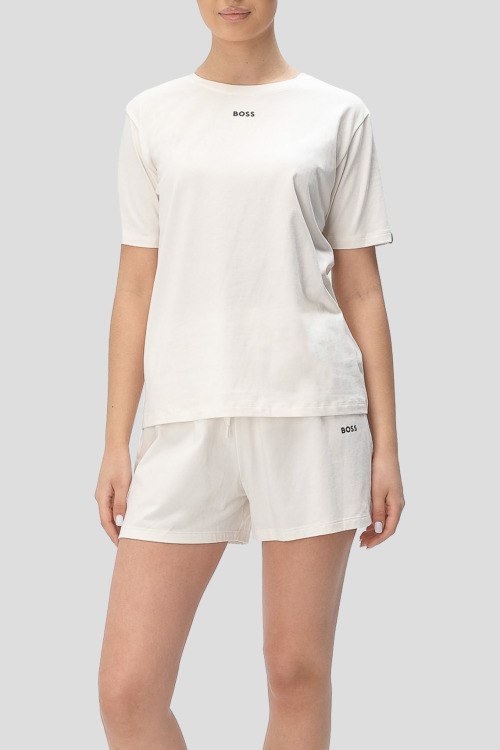 Детали: Женский комплект для дома молочного оттенка из хлопкового микса от Hugo Boss (Хуго Босс). Футболка классической длины, круглый вырез горловины, короткие рукава, логотип бренда на груди, короткие шорты с эластичной резинкой на поясе