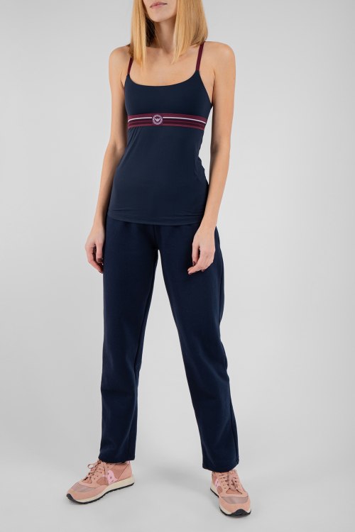 Женский темно-синий топ для дома от Giorgio Armani (Джорджио Армани). Модель на тонких регулируемых бретелях, облегающий силуэт, ровный низ изделия, фирменный логотип бренда.