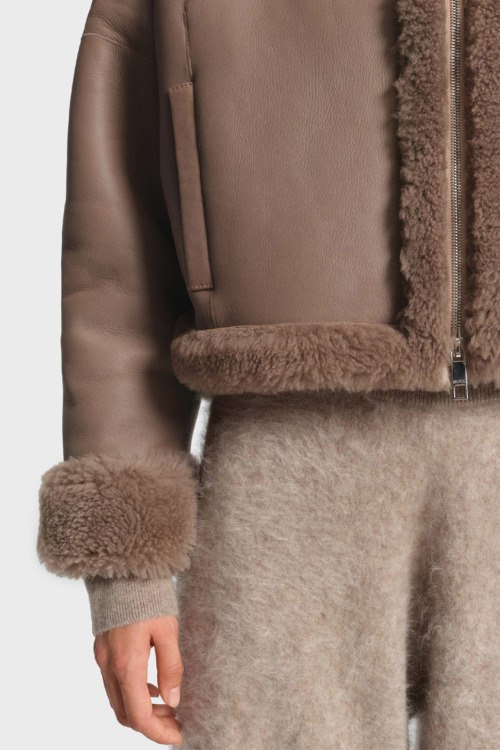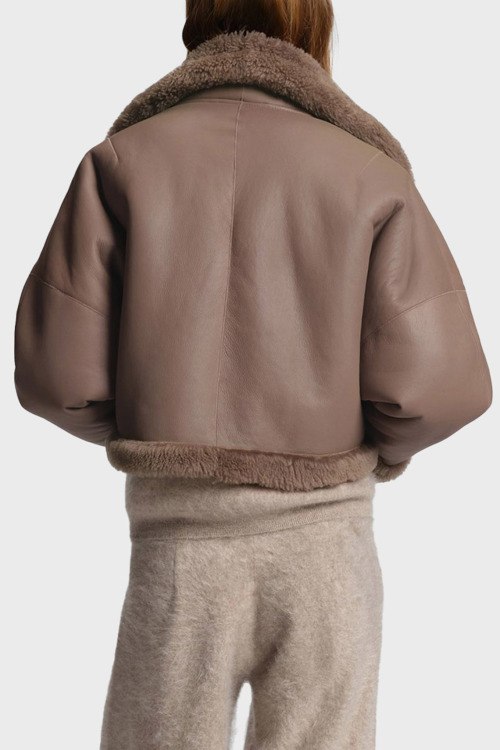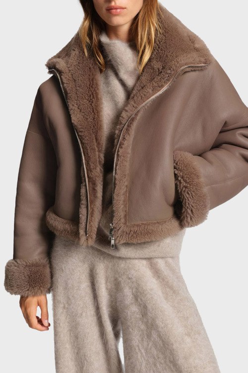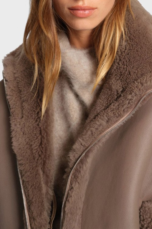 Детали: Женская коричневая дубленка из натуральной кожи от Hugo Boss (Хуго Босс). Застежка на молнию, меховая окантовка, высокий воротник-стойка, прорезные карманы