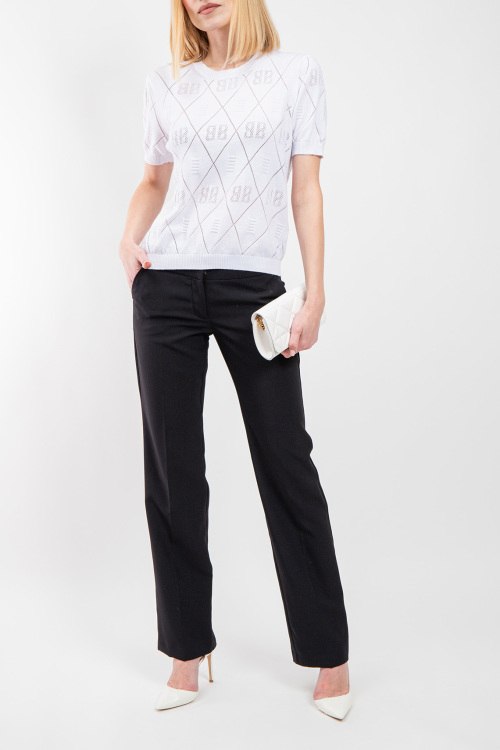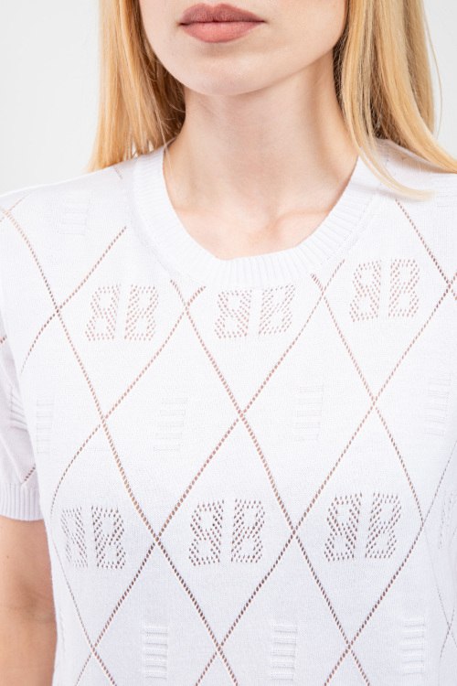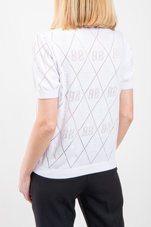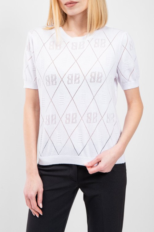 Женский белый джемпер из хлопка от Barbara Alvisi (Барбара Алвиси). Классическая длина, круглый вырез горловины, короткие рукава, перфорация, трикотажная резинка на манжетах и по низу изделия, логотип бренда. Замеры для размера S/M: длина: 59 см, ширина по груди: 50 см, ширина по талии: 49 см, ширина по бедрам 43 см длина рукава по внутреннему шву: 8 см, ширина рукава: 18 см.