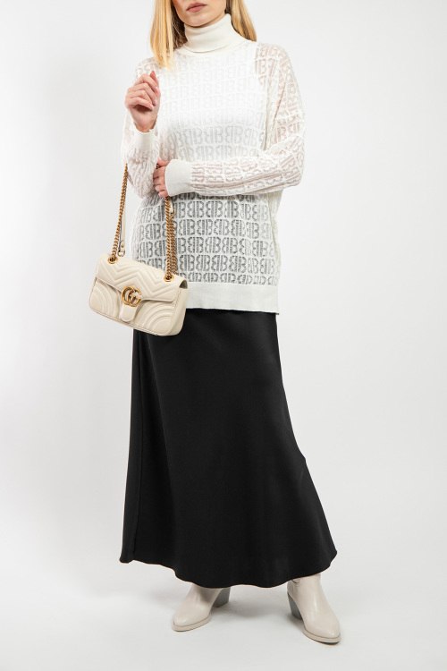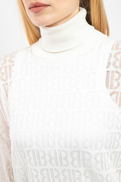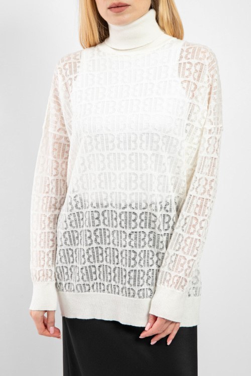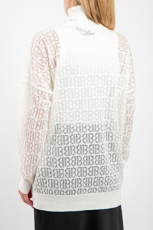 Женский белый джемпер из акрила и вискозы от Barbara Alvisi (Барбара Алвиси). Полупрозрачная модель с примесью шерсти, монограмма по всей поверхности, высокая горловина, манжеты и нижний край в рубчик, удлиненная длина.