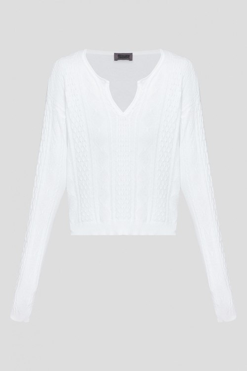 Детали: Женский белый пуловер из хлопка от Blauer (Блауэр). Классическая длина, фактурная вязка, V-образный горловины, длинные рукава. Измерения: длина рукава: длинный, для размера S – 60 см, обхват груди: для размера S – 90 см, обхват талии: для размера S – 84 см, длина изделия по среднему шву спинки от горловины: для размера S – 46,5 см. Производство: Италия