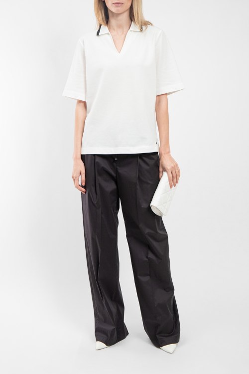 Женский белый джемпер-поло из хлопка и вискозы Wilka от Bogner (Богнер). Отложной воротник, V-образный вырез, короткий рукав, классическая длина.