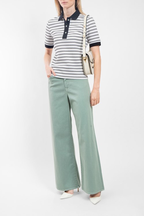 Женский белый джемпер-поло из хлопка и вискозы Wendy от Bogner (Богнер). Дизайн в полоску, отложной воротник, застежка на три пуговицы, короткий рукав, классическая длина.