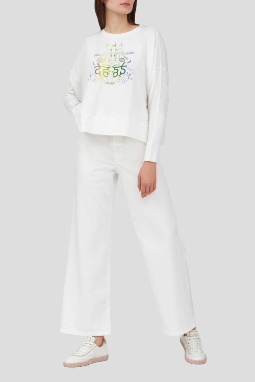 Женский белый джемпер из вискозы и хлопка от Deha (Деха). Принт на груди, круглый вырез горловины, классическая длина, трикотажные манжеты и нижний край. Параметры модели: 78-62-92, рост 179 см. На модели надет: S размер