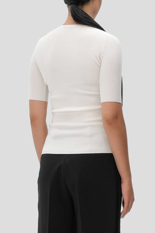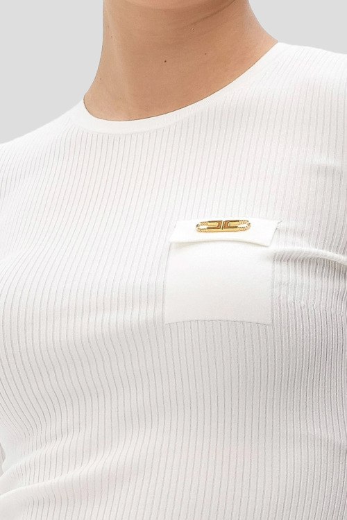 Детали: Женский белый трикотажный джемпер от Elisabetta Franchi (Елизабетта Франчи). Модель с примесью шелка, облегающий фасон, карман на груди, круглый вырез горловины, короткий рукав, классическая длина