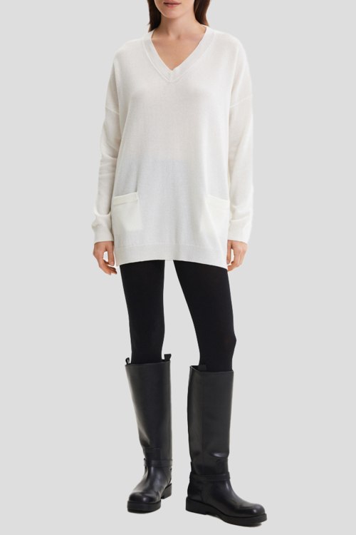 Детали: Женский белый пуловер из премиального кашемира от GD Cashmere (ГД Кашемир). Удлиненная модель, V-образный вырез горловины, длинные рукава, по бокам разрезы, логотип бренда, накладной карман. Рост модели: 172 cм. На модели продукт в размере 1