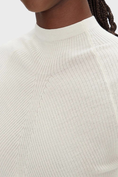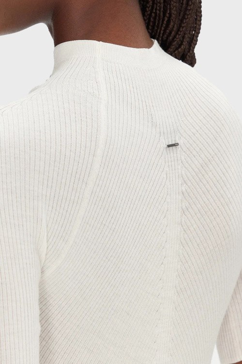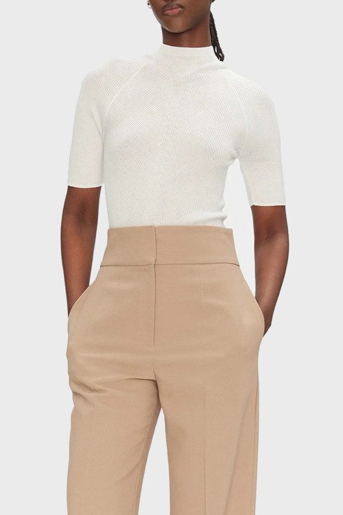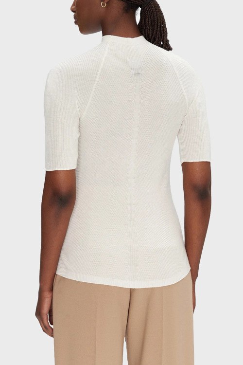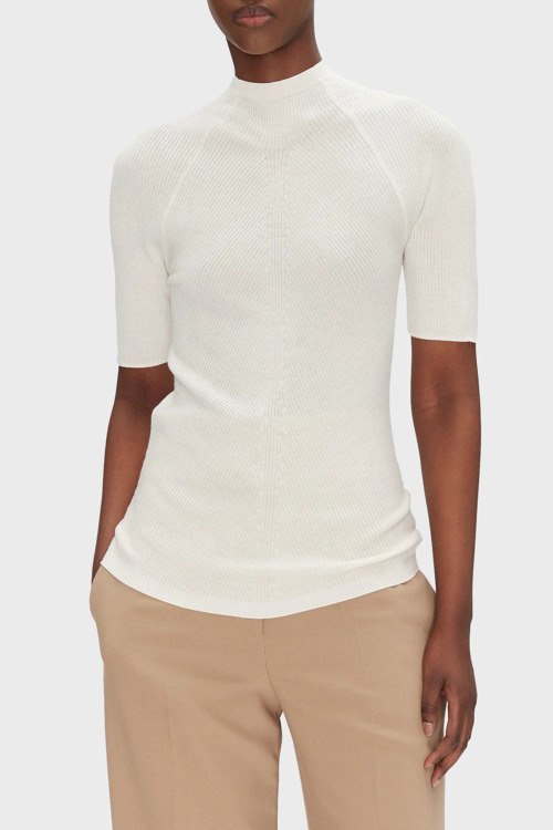 Детали: Женский белый шерстяной джемпер Faleri от Hugo Boss (Хуго Босс). Дизайн в рубчик, воротник-стойка, короткий рукав, классическая длина