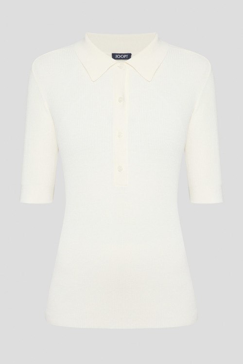 Детали: Женский белый трикотажный джемпер-поло от Joop! (Йооп!). Модель в рубчик, отложной воротник, застежка на четыре пуговицы, короткий рукав, классическая длина. Длина рукава: короткий, для размера 36 - 28 см, обхват груди: для размера 36 - 66 см, обхват талии: для размера 36 - 64 см, длина изделия по среднему шву спинки от горловины: для размера 36 - 60 см