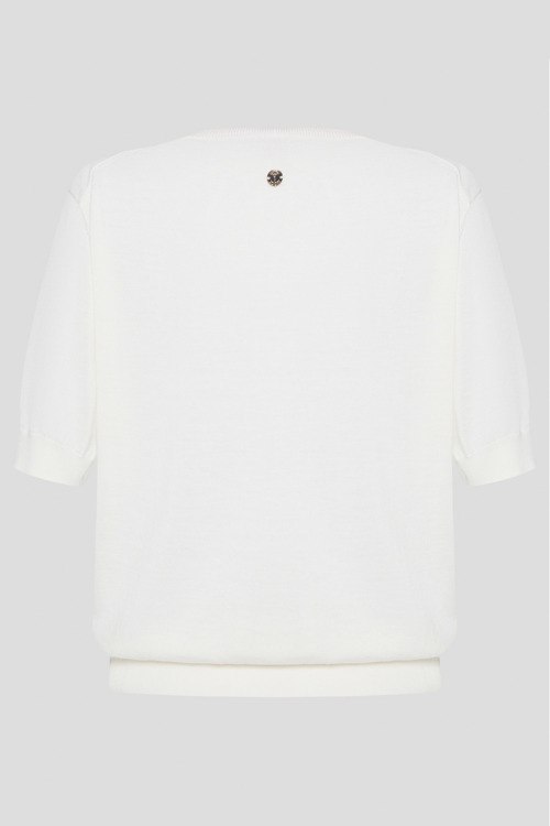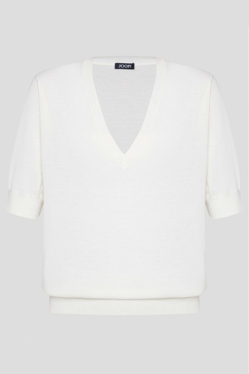 Детали: Женский белый шерстяной пуловер от Joop! (Йооп!). V-образный вырез, короткий рукав, классическая длина. Длина рукава: короткий, для размера 36 - 28 см, обхват груди: для размера 36 - 102 см, обхват талии: для размера 36 - 102 см, длина изделия по среднему шву спинки от горловины: для размера 36 - 57,5 см