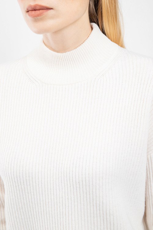 Женский белый джемпер из шерсти и кашемира Fufy от Max Mara Studio (Макс Мара Студио). Модель в рубчик, воротник-стойка, спущенная линия плеча, классическая длина.