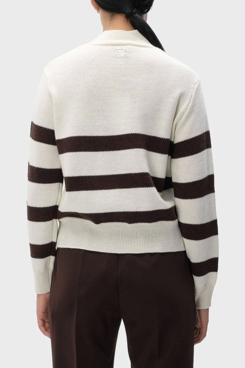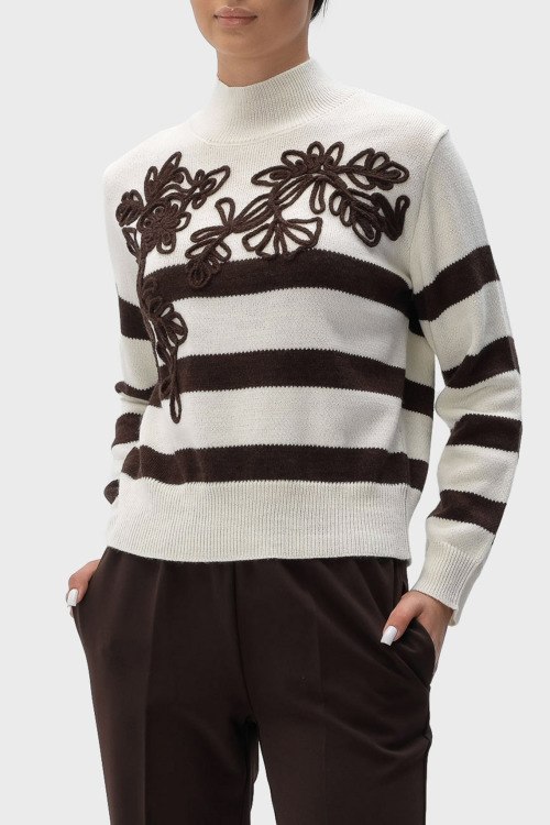 Детали: Женский белый джемпер из шерсти и акрила от Ermanno Scervino (Эрманно Шервино). Цветочная вышивка, коричневая полоска, высокая горловина, классическая длина, манжеты и нижний край в рубчик
