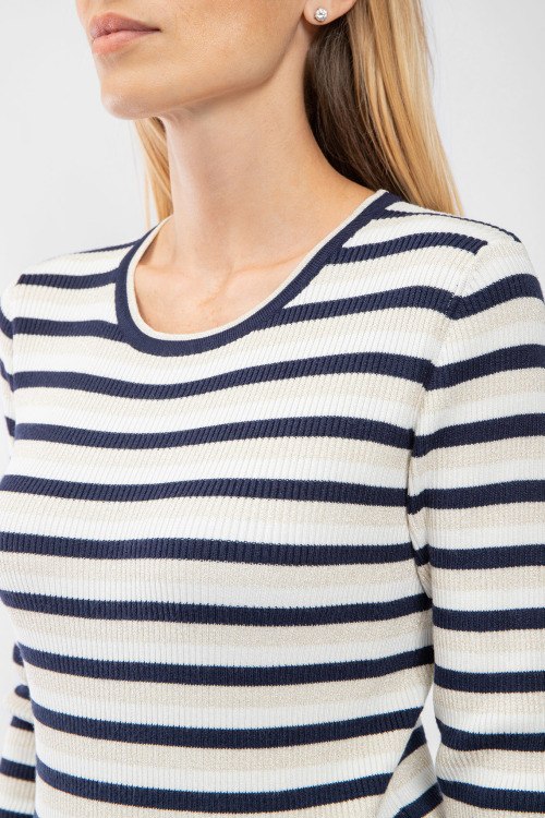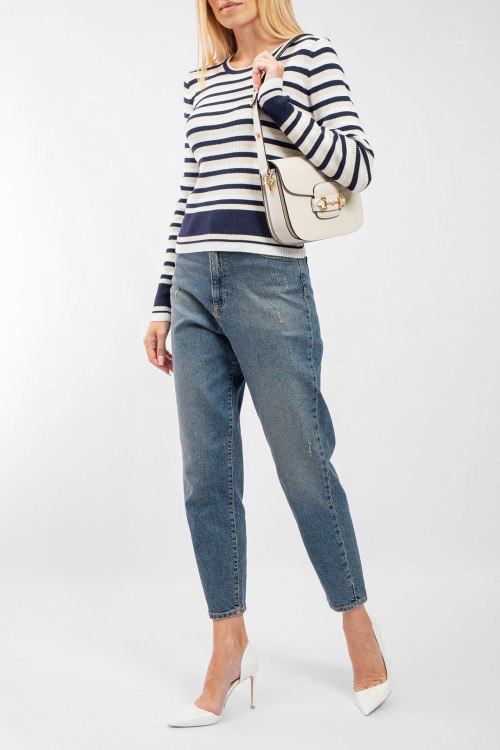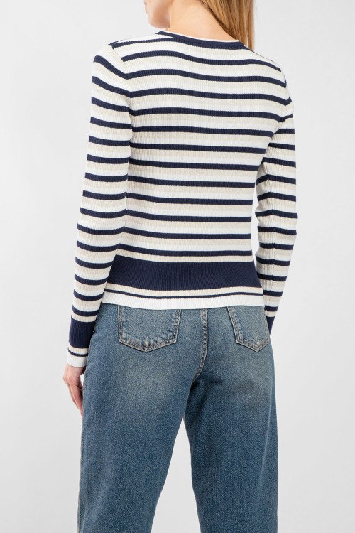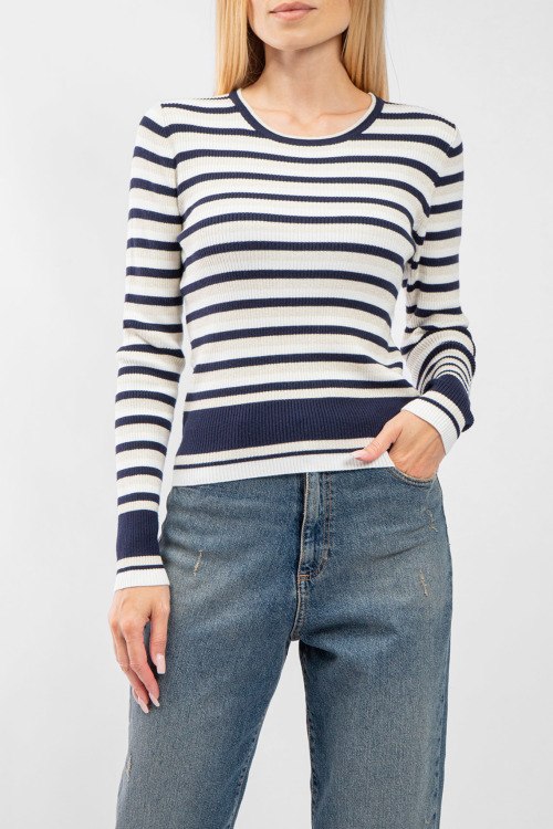 Женский белый трикотажный джемпер от Kocca (Кокка). Синяя полоска по всей поверхности, круглый вырез горловины, классическая длина.
