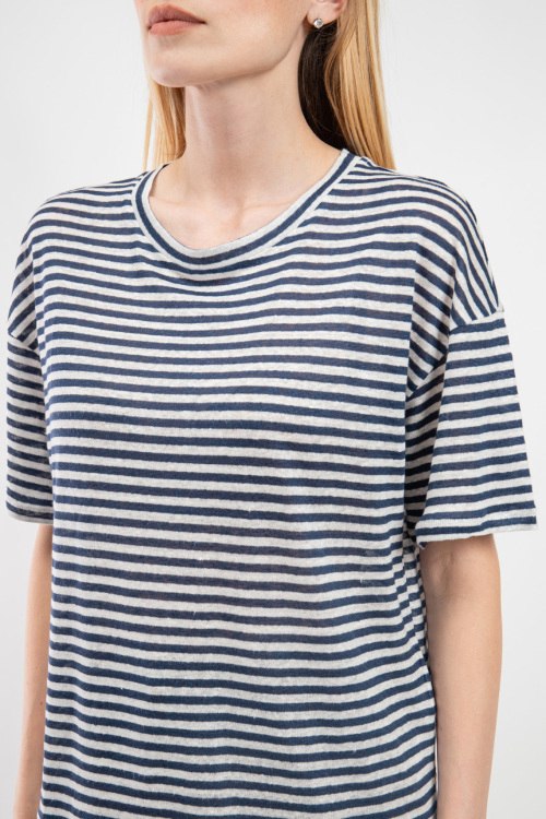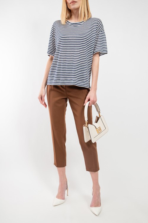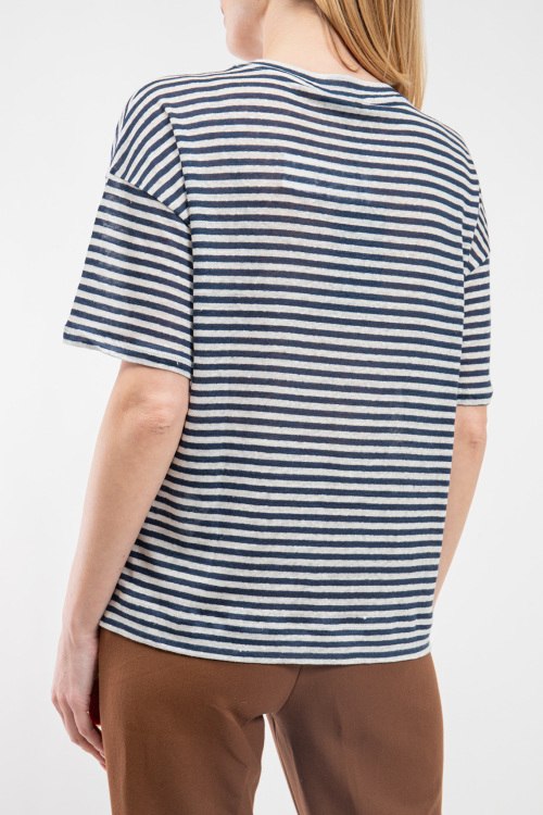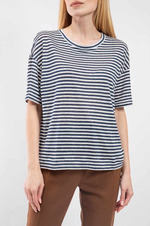 Женский бело-синий джемпер из трикотажа и льна Barca от Max Mara Weekend (Макс Мара Викенд). Полоска по всей поверхности, круглый вырез горловины, короткий рукав, классическая длина.