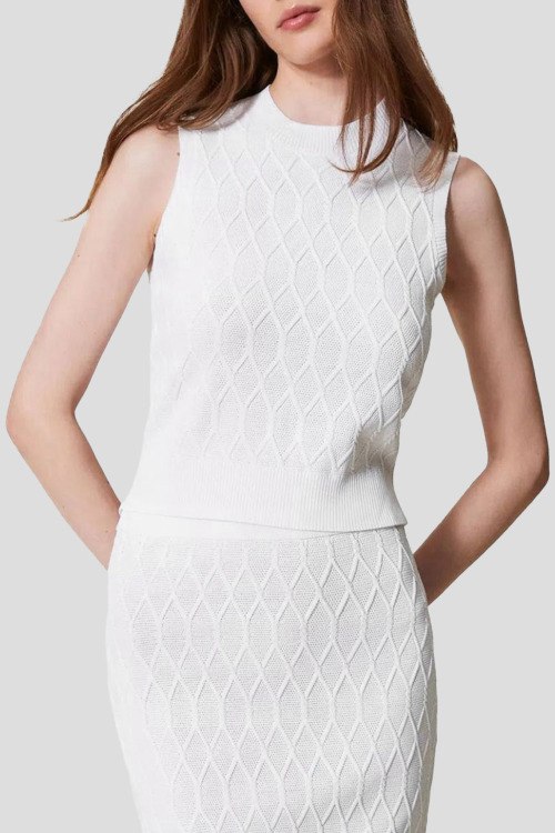 Детали: Женский белый трикотажный топ от TWINSET (Твинсет). Модель без рукавов, ромбовидный узор по всей поверхности, воротник-стойка, классическая длина