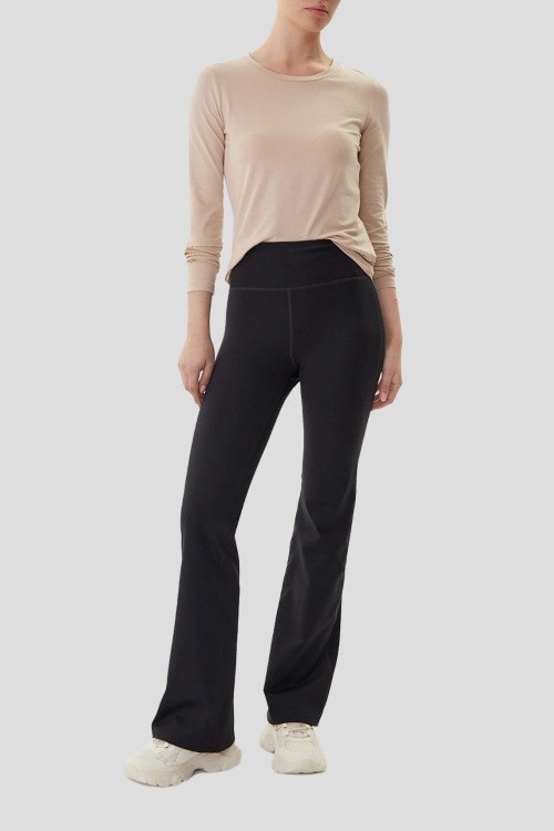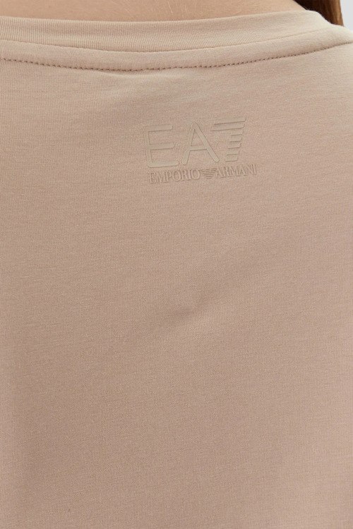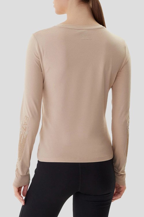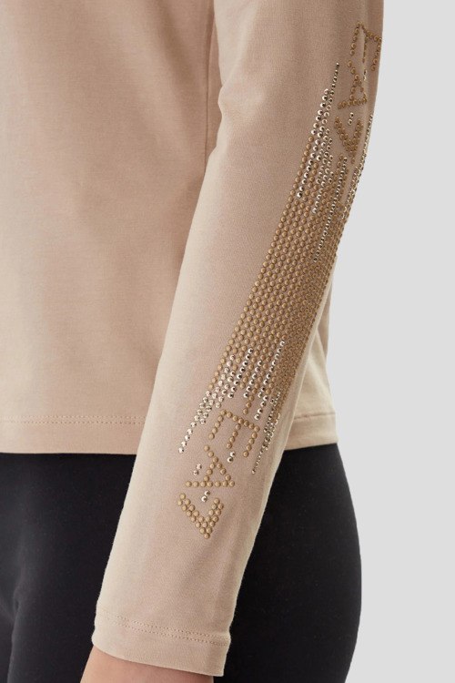 Детали: Женский бежевый хлопковый лонгслив от EA7 Emporio Armani (ЕА7 Эмпорио Армани). Декор кристаллами на рукавах, круглый вырез горловины, классическая длина