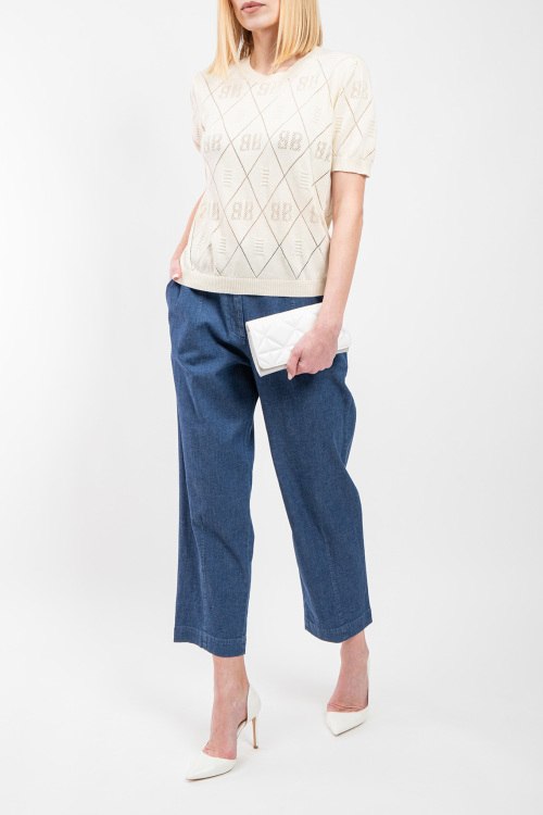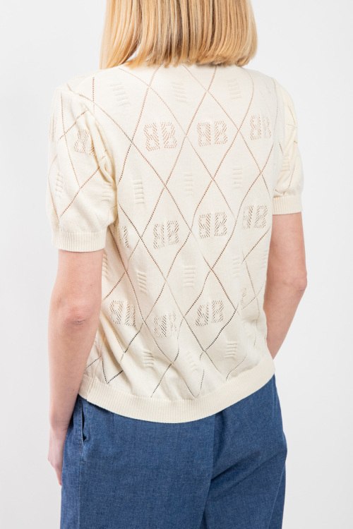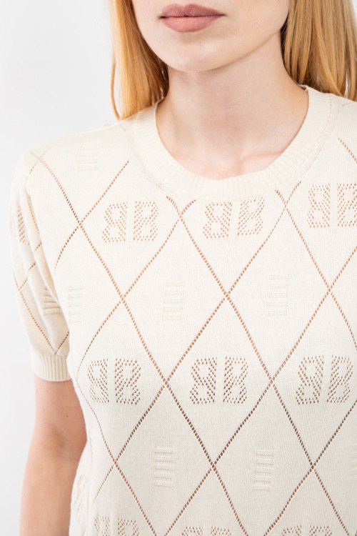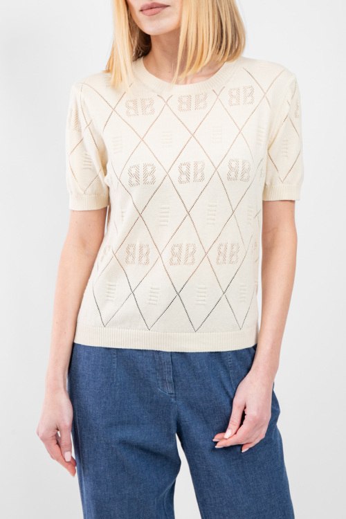 Женский бежевый джемпер из хлопка от Barbara Alvisi (Барбара Алвиси). Классическая длина, круглый вырез горловины, короткие рукава, перфорация, трикотажная резинка на манжетах и по низу изделия, логотип бренда. Замеры для размера:S/M длина: 59 см, ширина по груди: 50 см, ширина по талии: 49 см, ширина по бедрам 43 см длина рукава по внутреннему шву: 8 см, ширина рукава: 18 см.