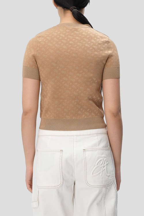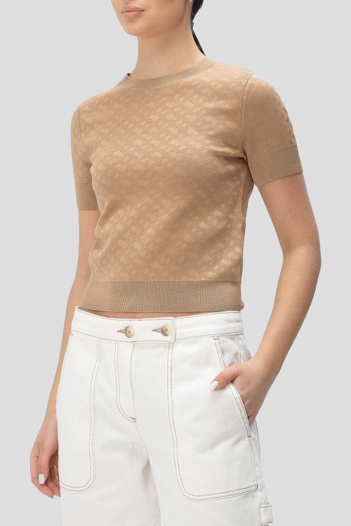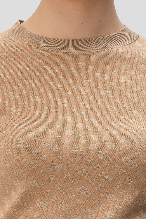 Детали: Женский бежевый трикотажный джемпер Forkena от Hugo Boss (Хуго Босс). Узор по всей поверхности, круглый вырез горловины, короткий рукав, манжеты и нижний край в рубчик