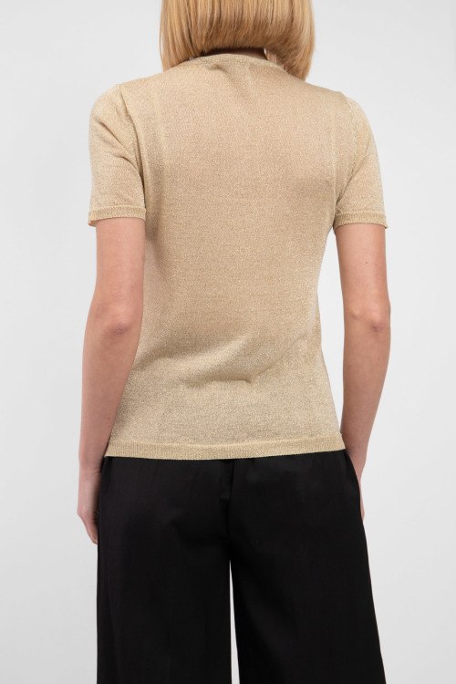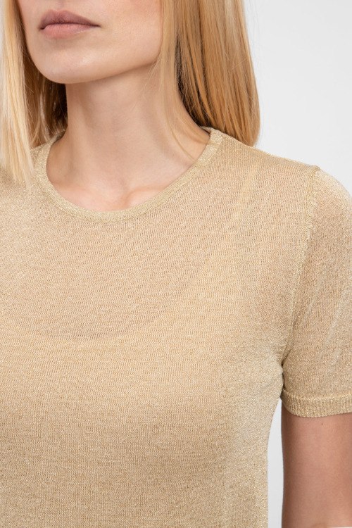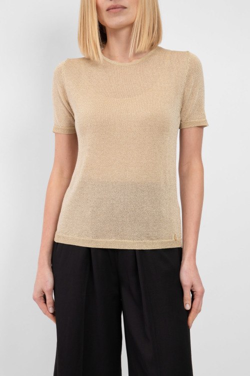 Женский бежевый джемпер из вискозного микса от Kocca (Кокка). Классическая длина, круглый вырез горловины, короткие рукава, логотип бренда, модель с люрексовой нитью.
