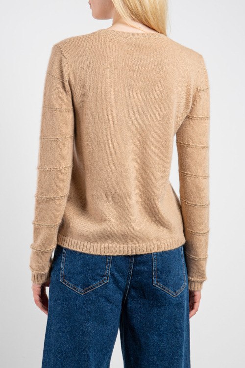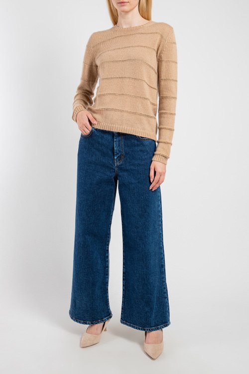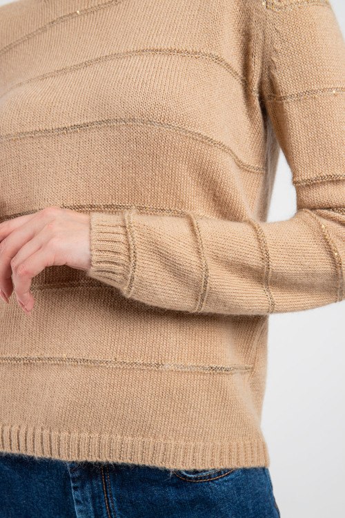 Женский бежевый джемпер из микса мохера и акрила от Max Mara (Макс Мара). Классическая длина, трикотажная резинка на манжетах и по низу изделия, длинные рукава, круглый вырез горловины, узор в горизонтальную полоску с пайетками.