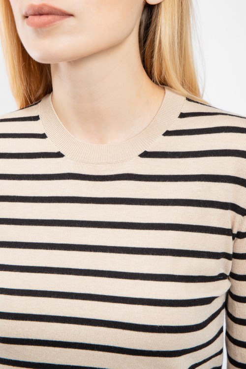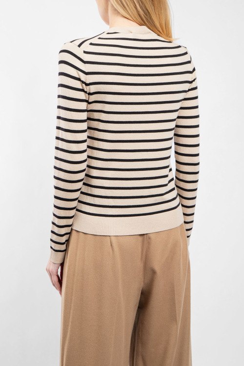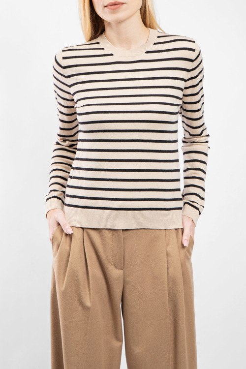 Женский бежевый джемпер из шелка и шерсти Sicilia от Max Mara Weekend (Макс Мара Викенд). Черная полоска по всей поверхности, круглый вырез горловины, классическая длина, ребристые манжеты и нижний край.