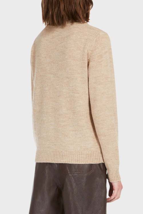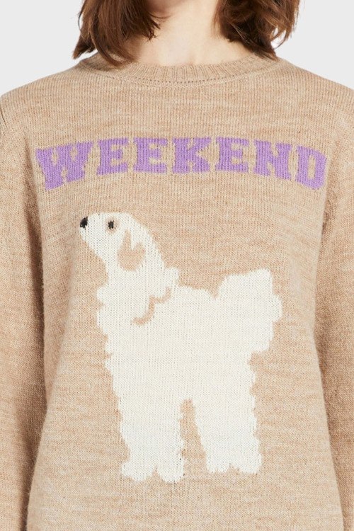 Детали: Женский бежевый джемпер из микса шерсти и альпаки от Max Mara Weekend (Макс Мара Викенд). Классическая длина, круглый вырез горловины, длинные рукава, трикотажная резинка на манжетах и по низу изделия, модель декорирована принтом с логотипом бренда