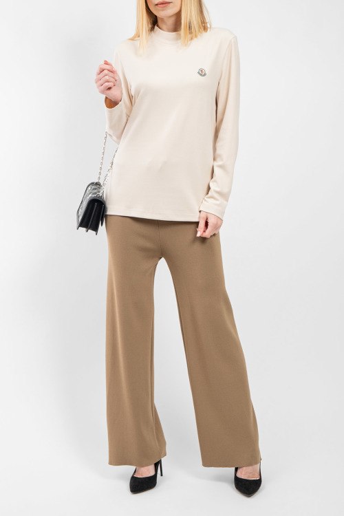 Женский бежевый лонгслив из хлопка от Moncler (Монклер). Круглый вырез горловины, длинные рукава, патч-лого на груди. Замеры для размера на фото: 2; длина - 67 см; ПОГ - 51 см; ПОТ - 48 см; ПОБ - 48 см; длина по внутреннему шву рукава - 47 см; ширина рукава - 18 см.
