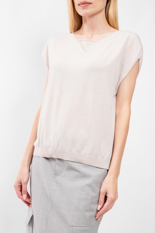 Женский бежевый хлопковый джемпер от Panicale Cashmere (Паникале Кашемир). Круглый вырез горловины, короткий рукав, классическая длина. Размер вещи на фото: 42, длина спереди: 58 см, ширина по груди: 55 см, ширина по талии: 55 см.