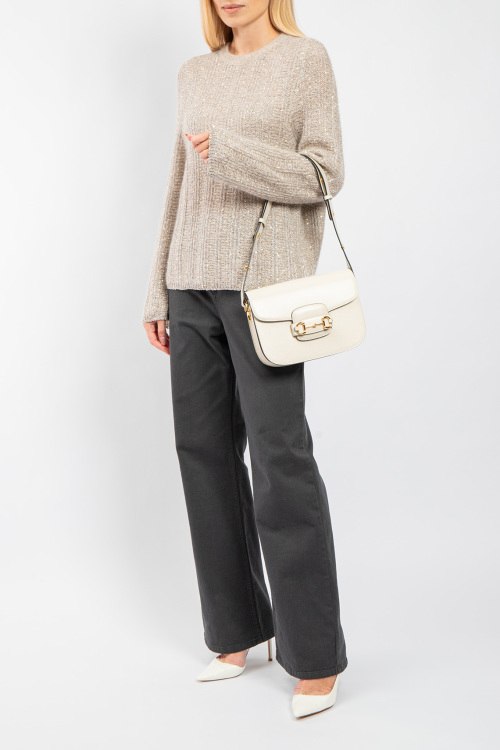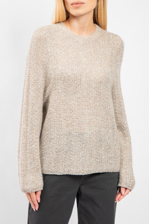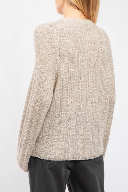 Женский бежевый джемпер из альпаки и мохера от Panicale Cashmere (Паникале Кашемир). Декор пайетками, круглый вырез горловины, классическая длина. Размер вещи на фото: 42. Замеры: длина спереди: 57 см, ширина по груди: 56 см, ширина по талии 53 см, длина рукава 38 см, ширина рукава 18 см.