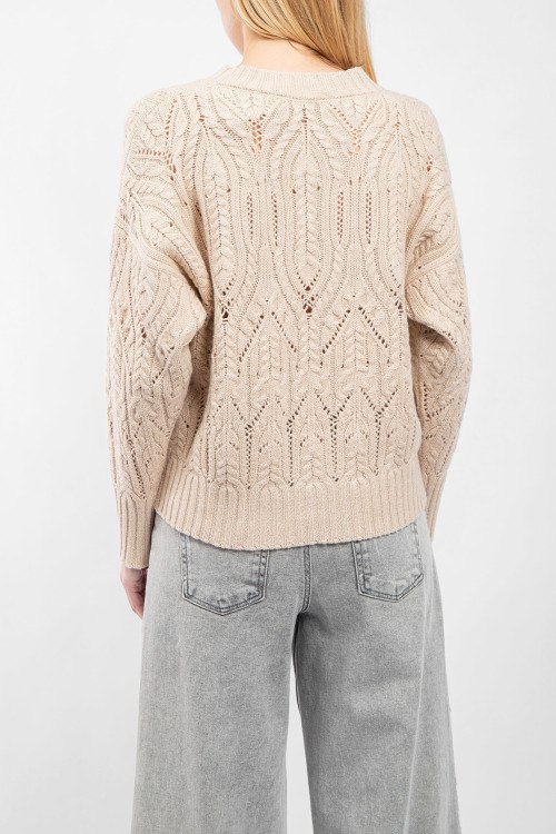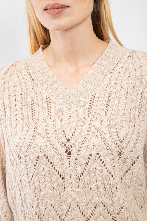 Женский бежевый пуловер из шерсти и шелка от Panicale Cashmere (Паникале Кашемир). Модель с примесью кашемира, вязаный узор, V-образный вырез, классическая длина.